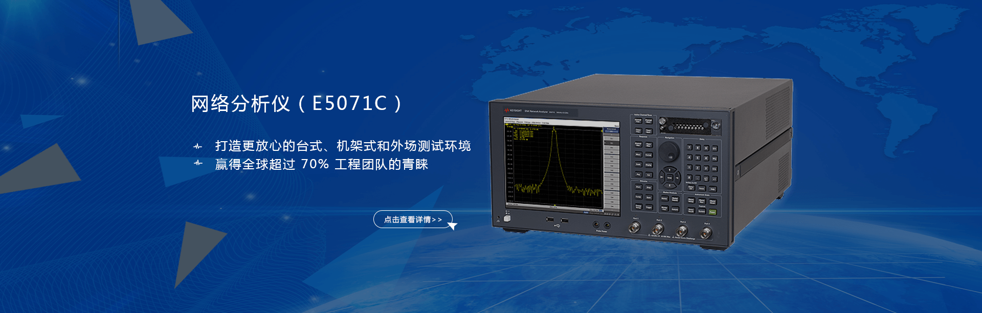 主要產(chǎn)品有:頻譜分析儀,網(wǎng)絡(luò)分析儀,綜合測(cè)試儀,藍(lán)牙wifi測(cè)試儀,噪聲系數(shù)測(cè)試儀,接收機(jī),電話測(cè)試儀,高、低頻信號(hào)源,音、視頻信號(hào)分析儀,高精度萬用表, LCR/ 電橋、各種通信電源等。經(jīng)營的儀器品牌主要有:Keysight/Agilent (惠普 / 安捷倫)、 R/S (羅德 & 施瓦茨)、 Anritsu (安立)、Litepoint、 FLUK( 福祿克 ) 、 TEK (泰克)等。